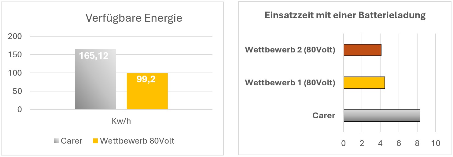 Durch die 96 Volt Technologie bietet eine bis zu 60% höhere Batteriekapazität im Vergleich zu Wettbewerbsgeräten. Zum Beispiel: Ein 8 Tonnen Elektrostapler des Markführers hat 80 Volt und eine 1.240 Ah Batterie, also eine verfügbare Batteriekapazität von 99,2 KW ( 80 x 1240 = 99.200 Watt : 1000 = 99,2 Kilowatt). Der vergleichbare Carer Stapler hat 96 Volt und 1.720 Ah = 165,12 Kilowatt